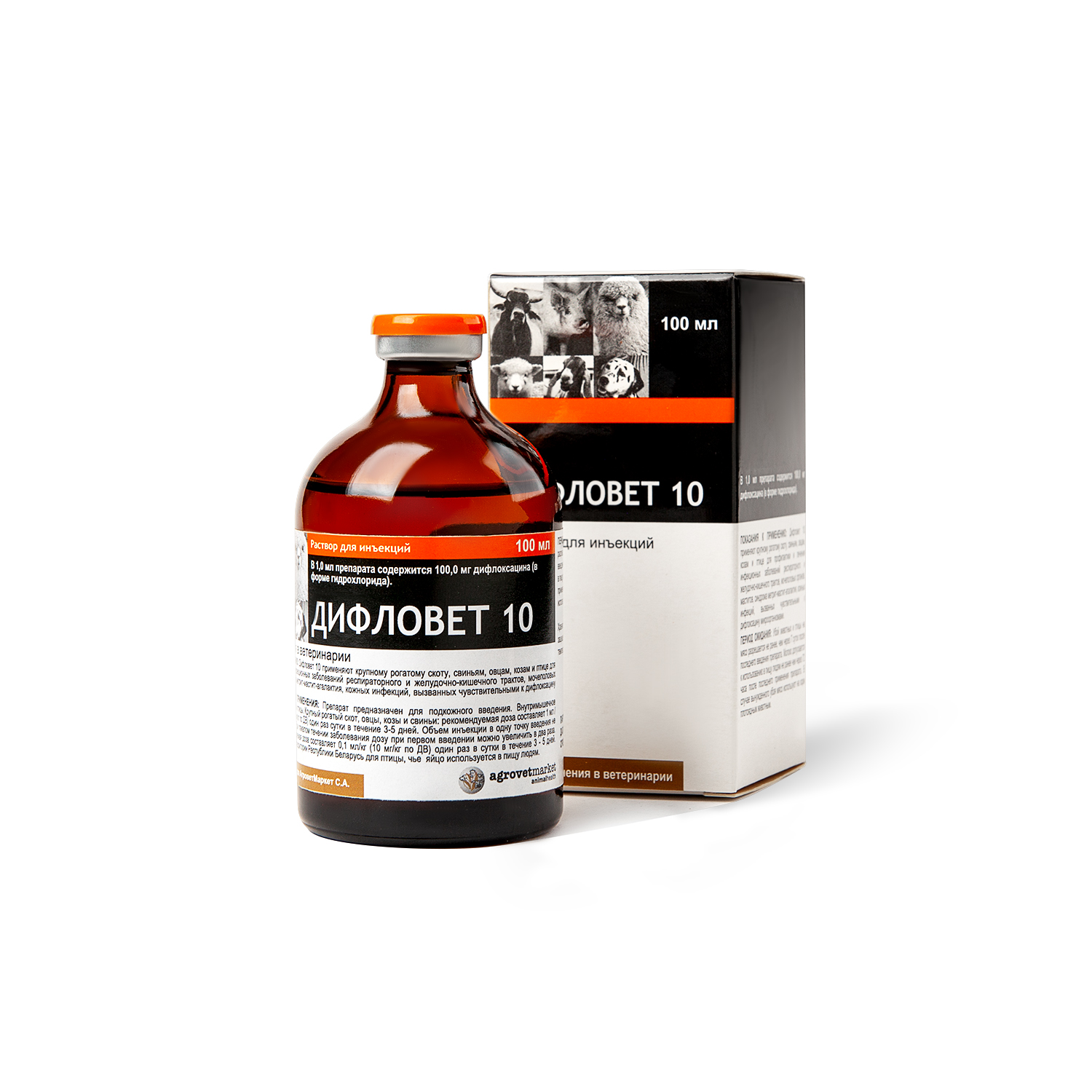 Дифловет 10 применяют крупному рогатому скоту, свиньям, овцам, козам и птице для профилактики и лечения инфекционных заболеваний респираторного и желудочно-кишечного трактов, мочеполовых органов, маститов, синдрома метрит-мастит-агалактия, кожных инфекций, вызванных чувствительными к дифлоксацину микроорганизмами.Способ применения и дозы:
