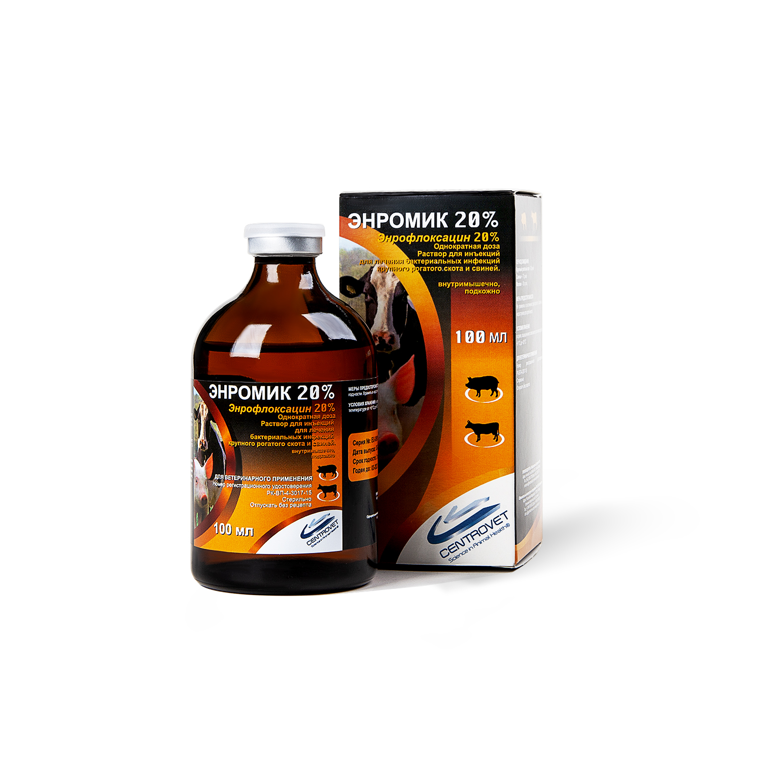 Убой свиней на мясо разрешается не ранее, чем через 17 суток, крупного рогатого скота – не ранее, чем через 28 суток после последнего применения Энромика 20%. Молоко дойных коров разрешается использовать в пищевых целях не ранее, чем через 10 суток после последнего введения препарата. Молоко, полученное ранее указанного срока, после кипячения может быть использовано в корм животным.Производитель: «Центровет», Чили.