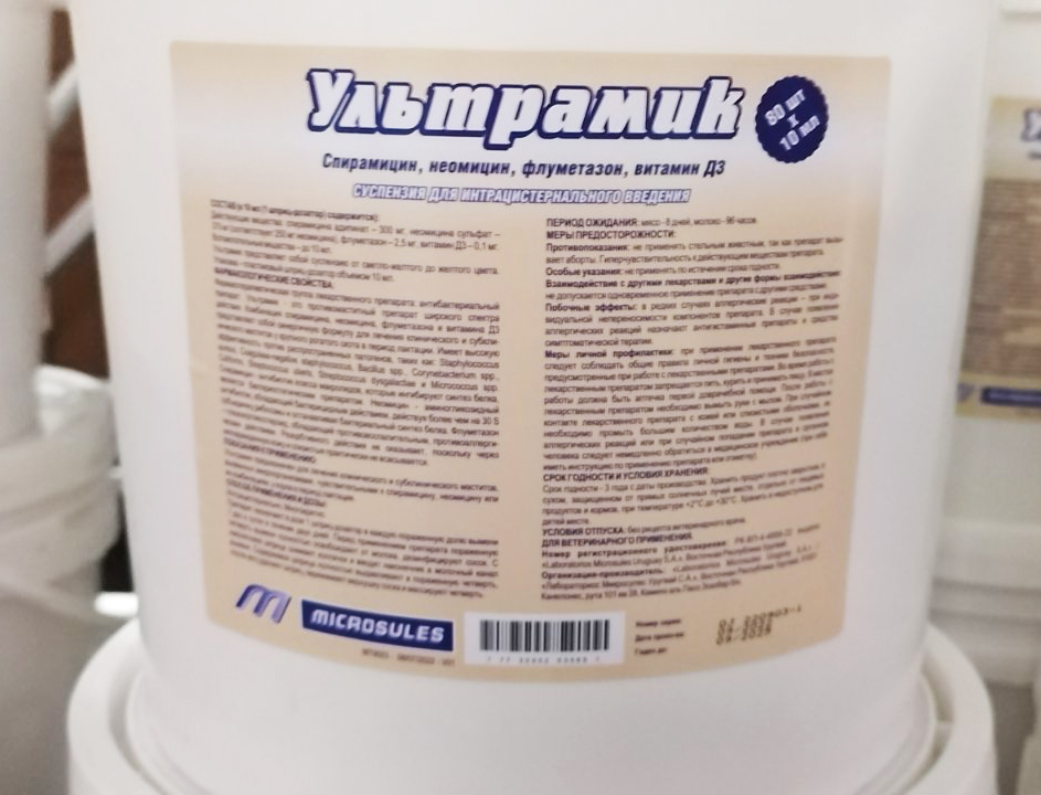 Ультрамик предназначен для лечения клинического и субклинического маститов, вызванных микроорганизмами, чувствительными к спирамицину, неомицину или их комбинациям, у коров в период лактации.