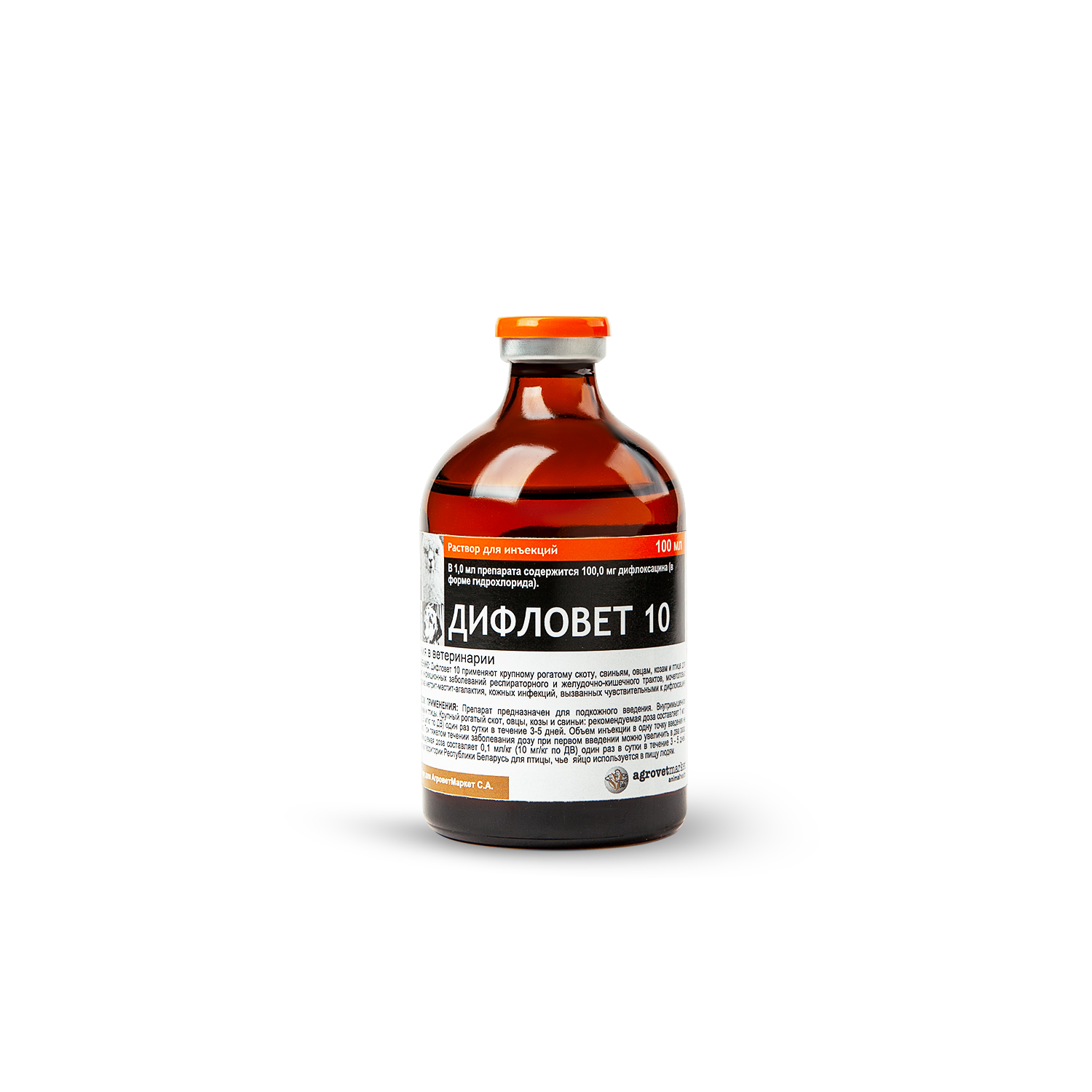 Дифловет 10 применяют крупному рогатому скоту, свиньям, овцам, козам и птице для профилактики и лечения инфекционных заболеваний респираторного и желудочно-кишечного трактов, мочеполовых органов, маститов, синдрома метрит-мастит-агалактия, кожных инфекций, вызванных чувствительными к дифлоксацину микроорганизмами.Способ применения и дозы: