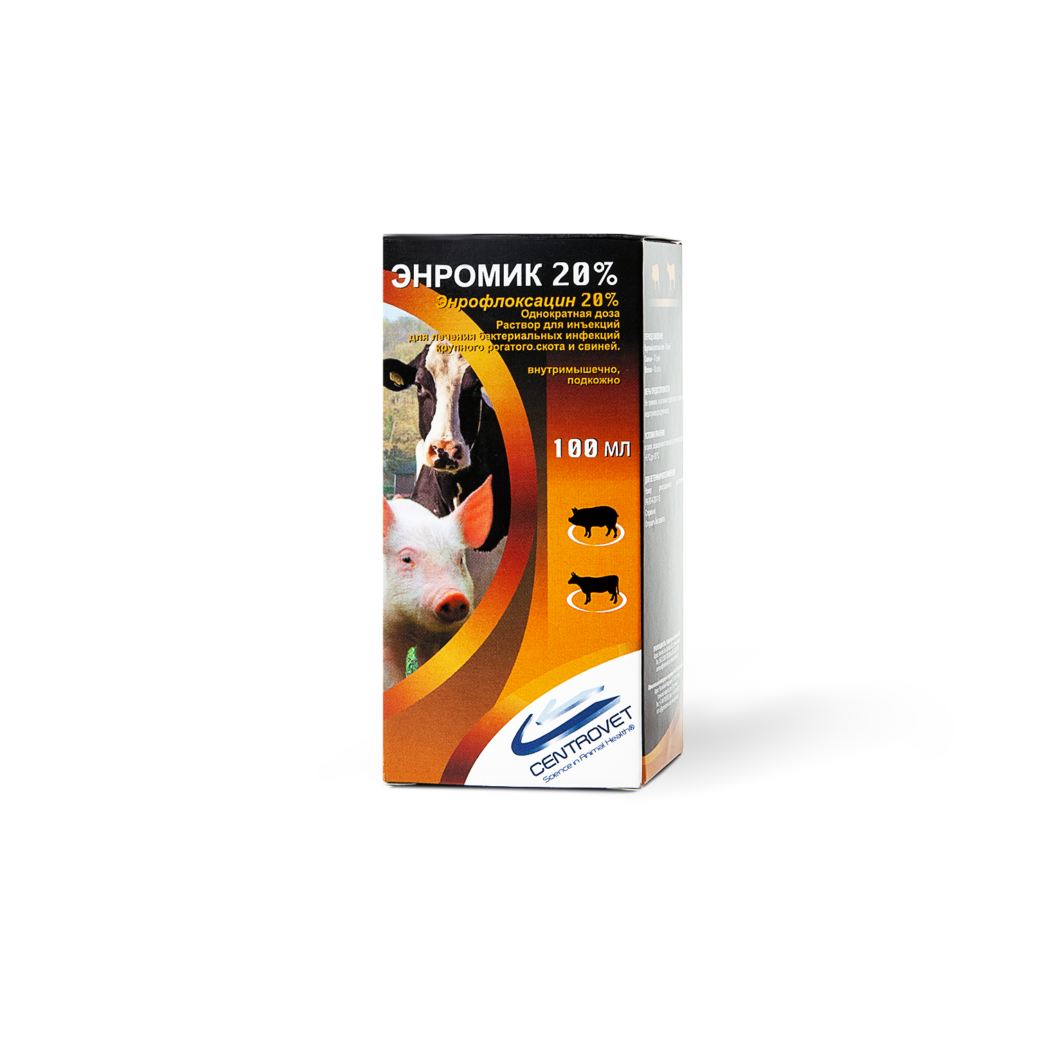 Энромик 20% применяют крупному рогатому скоту и свиньям с лечебной целью при инфекциях органов дыхания, желудочно-кишечного тракта, мочеполовой системы, маститах, синдроме ММА, септицемии, колибактериозе, сальмонеллёзе, стрептококкозе, бактериальной и энзоотической пневмонии, атрофическом рините и других заболеваниях бактериальной и микоплазменной этиологии, возбудители которых чувствительны к энрофлоксацину.Способ применения и дозы: